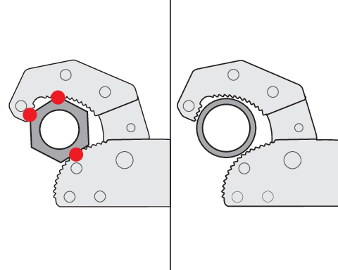 - posiadają także hartowane zęby o twardości 46~52 HRC. ich specjalnie wyprofilowany kształt powoduje, że wraz ze wzrostem siły nacisku na klucz coraz mocniej wgryzają się w materiał, zwiększając przyczepność i zapobiegają ślizganiu się
