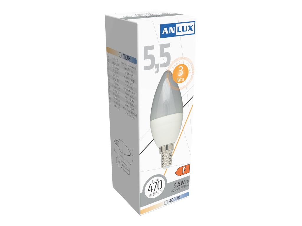Żarówka LED, zamiennik tradycyjnej żarówki dekoracyjnej. Do ogólnego przeznaczenia oświetleniowego do domu, przestrzeni biurowych, gospodarczych, magazynowych i ciągów komunikacyjnych, zastosowanie m. in. w dekoracyjnych oprawach oświetleniowych. Moc 5,5W w barwie neutralnej – 4000K. Klosz żarówki jest mleczny.